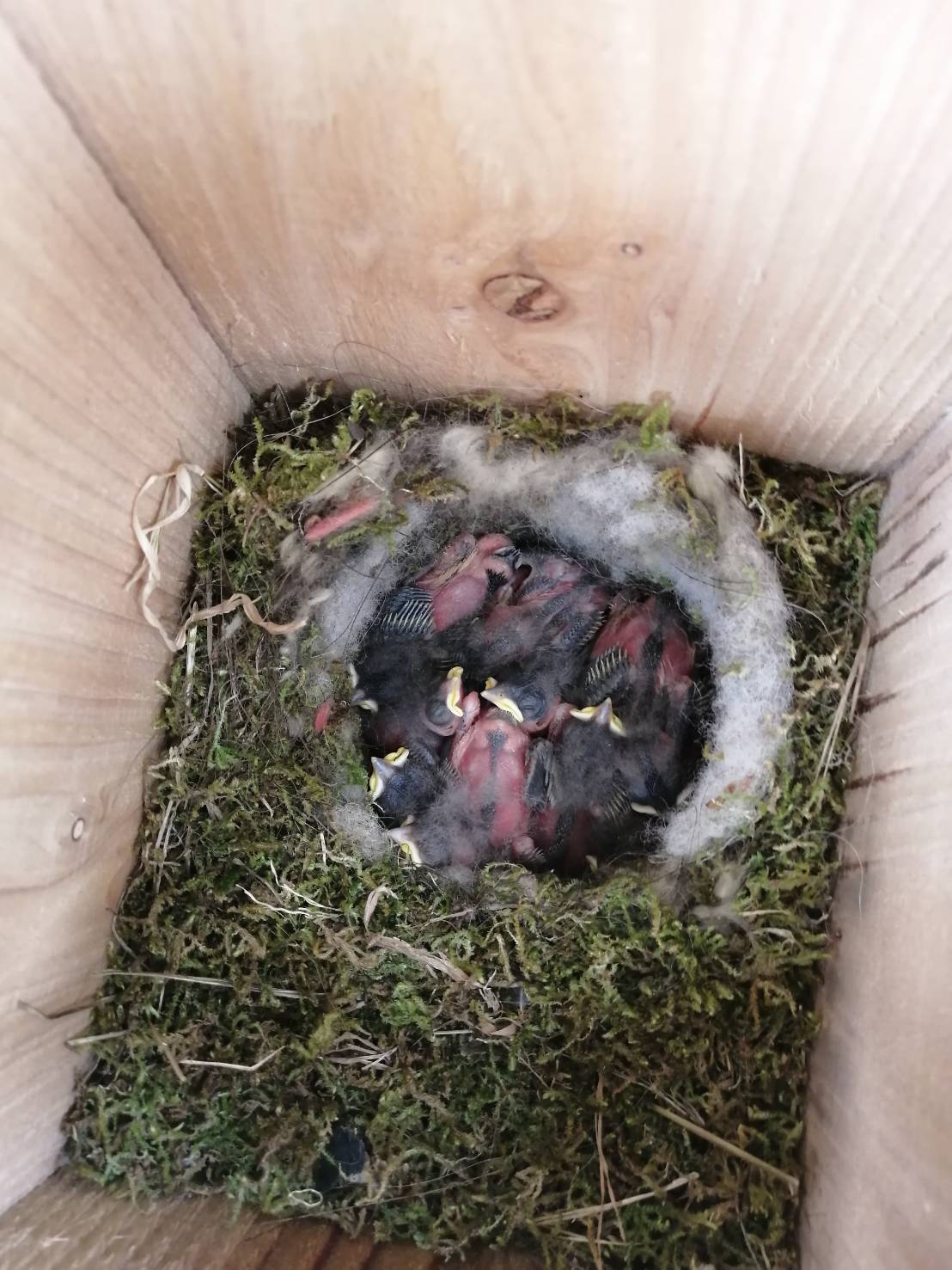 5月に入り、巣箱の穴から小さなヒナの口が見えました。ヒナがかえったのです。